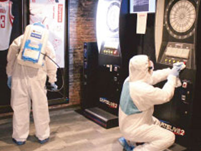 バーカウンターや椅子、お酒のボトルを除菌します。ダーツマシーンなどの機器は壊れないよう1台ずつ手作業で拭きます。