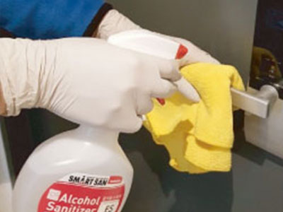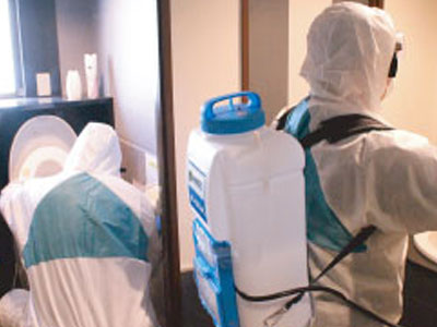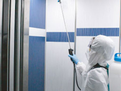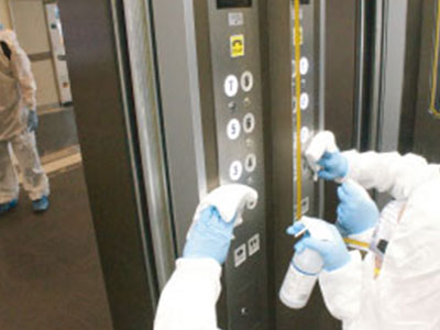 除菌は人が触れやすいドアノブやエレベーターの操作パネル、テーブルや椅子、菌の付着しやすい壁や床を中心に行います。