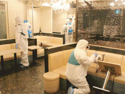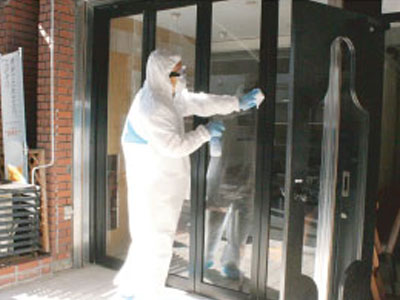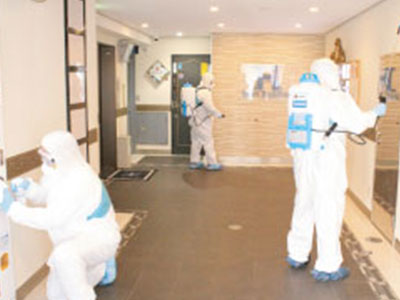 雑居ビルの入り口やEVホール、集合看板などを防護服を着たスタッフが噴霧器と拭き作業で除菌を行います。