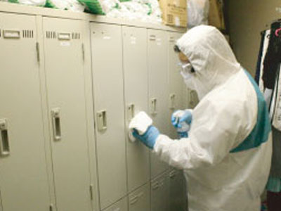 シューズカバー・手袋など完全防護をし、作業にあたります。