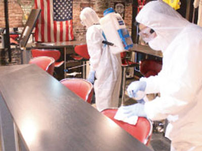お客様の座る椅子やテーブルを拭き掃除し、厨房は残留しない薬品または、人体に影響のないもので消毒いたします。